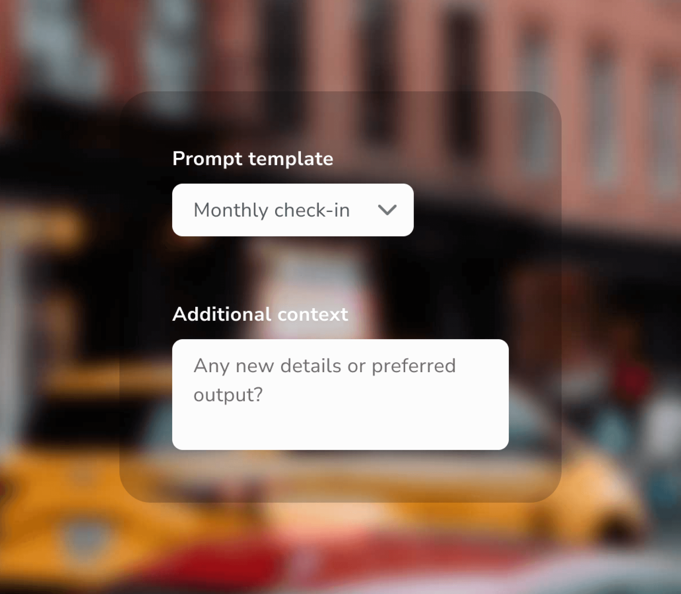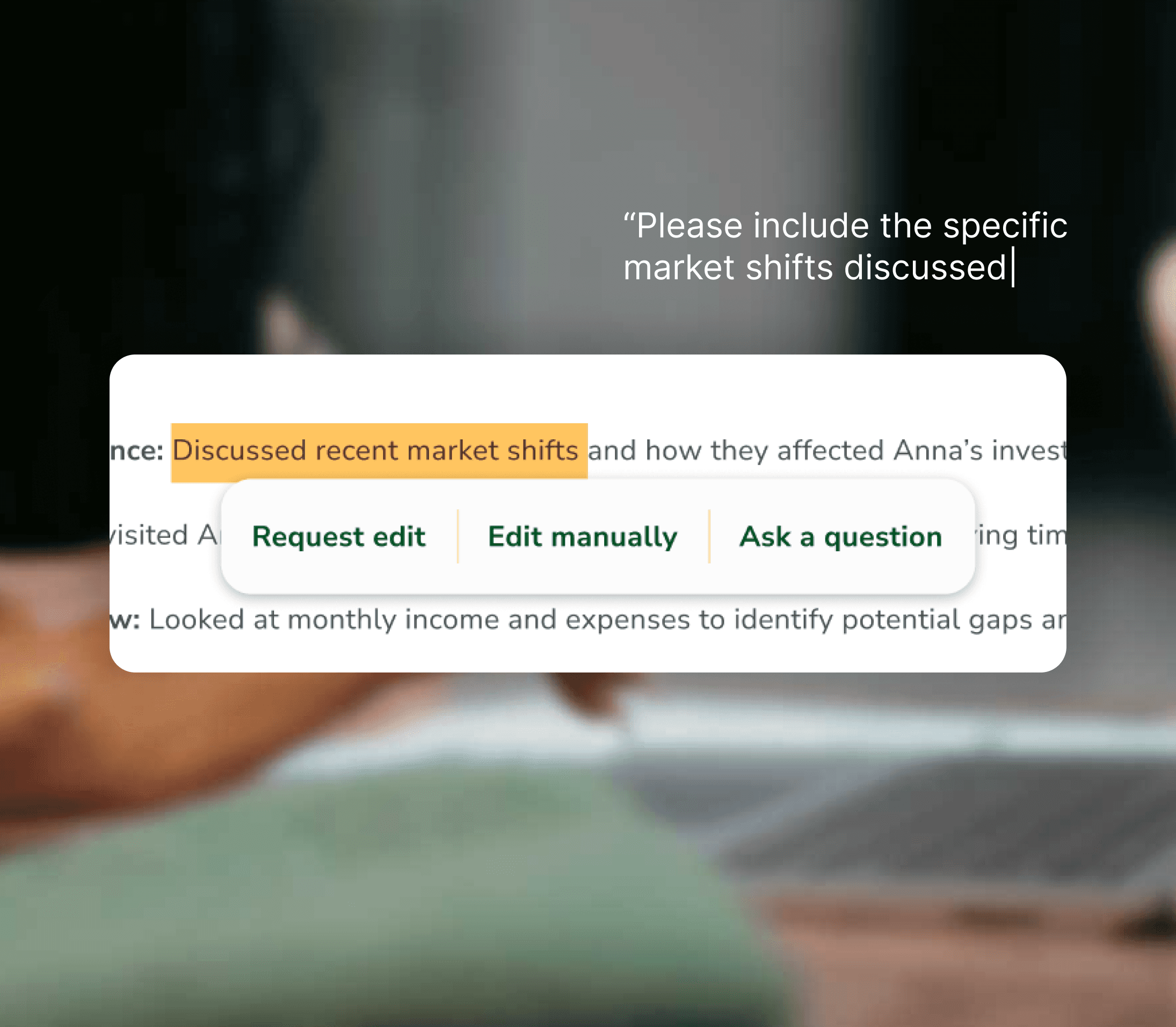 Providing agency looks like allowing Wealth Managers to select summary templates or add extra context to steer the LLM before any summarisation. The template defines the prompt, and any additional context is injected in.