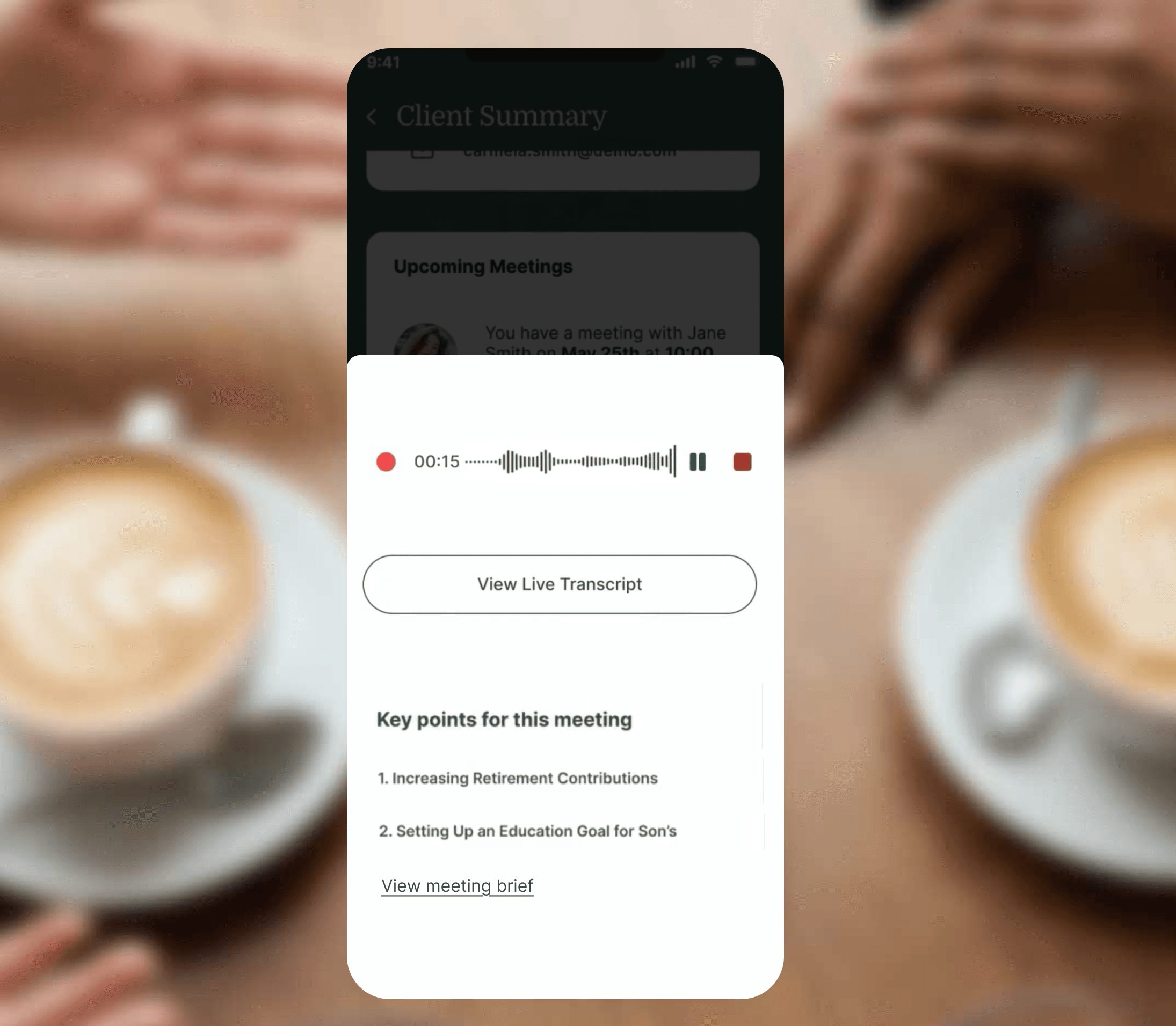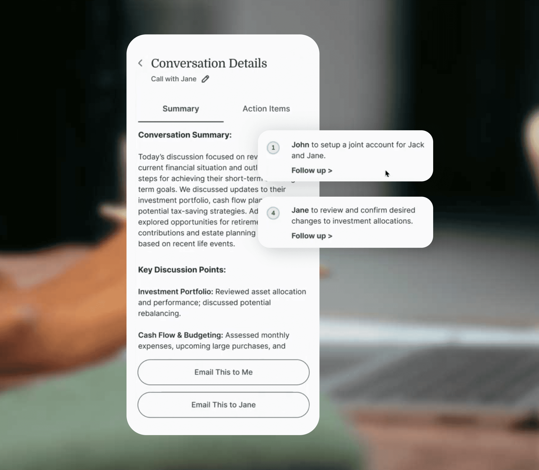 After the meeting, summary is produced as per the wealth managers preference and actions are extracted. Full transcript is viewable.